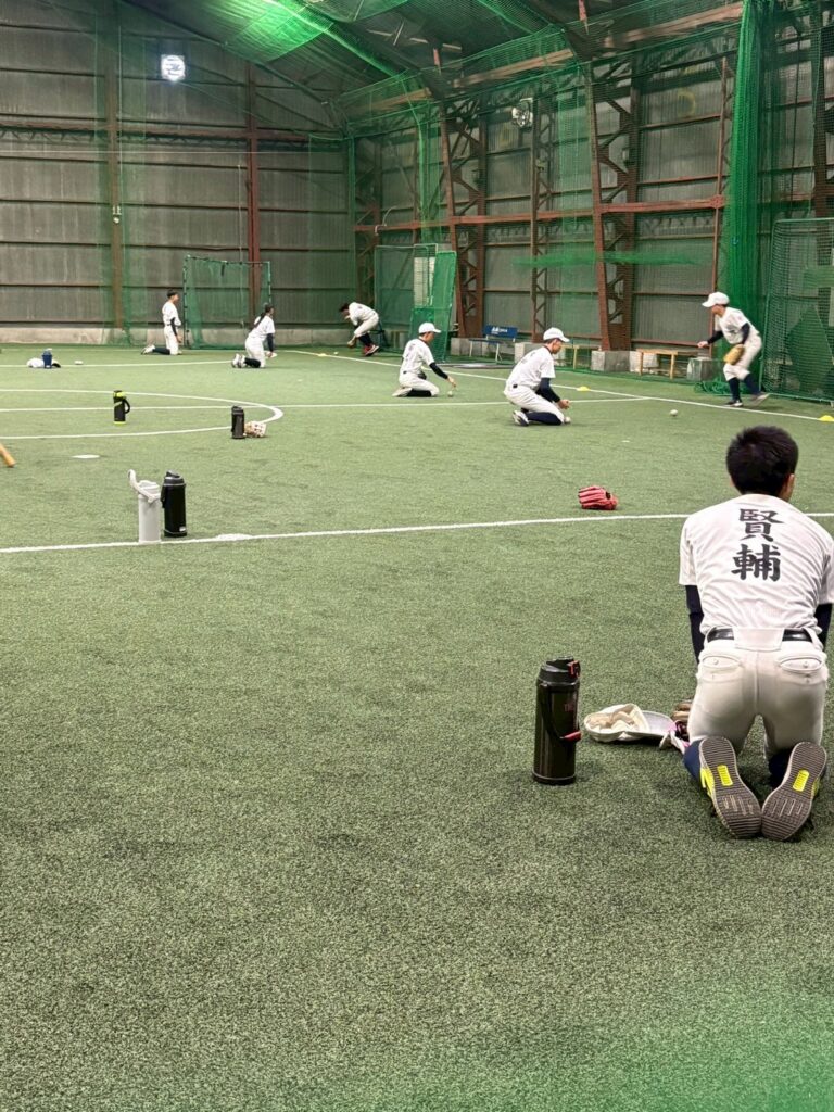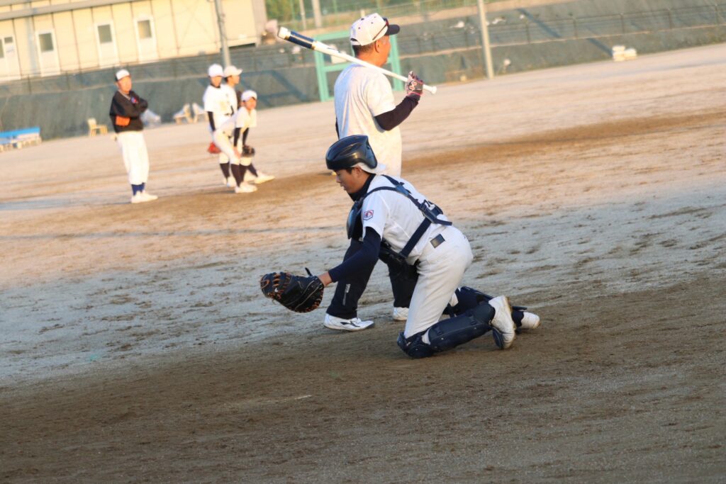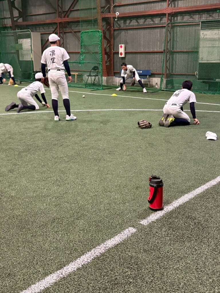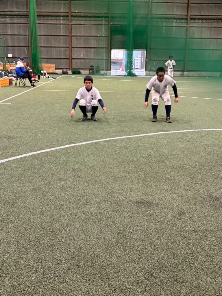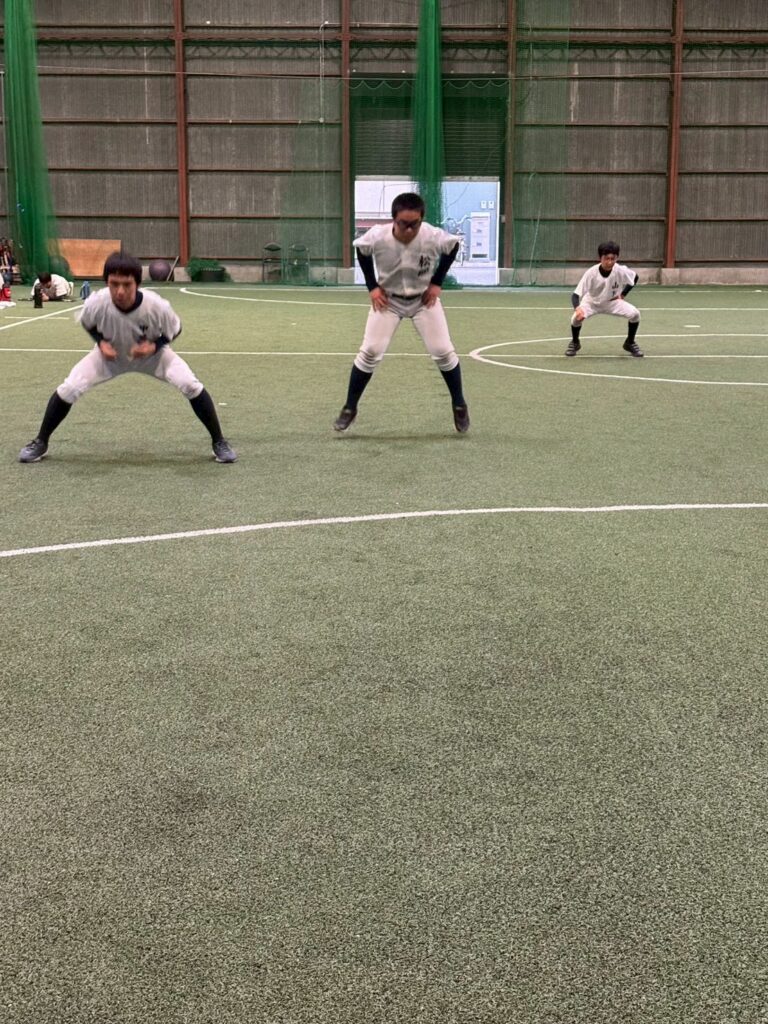 2.3年生はブリスフィールドで練習を行いました。アップを終えてからシャトルランとキャッチボールで体を温め終えると投手・野手に分かれて練習を行いました。投手はピッチング練習・野手はノックを受けて守備練習を行った後、投手に端からボールを転がしてもらい股割りをしながらの捕球、走りながらの捕球の練習で午前が終了しました。
