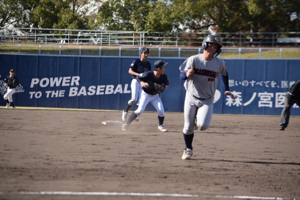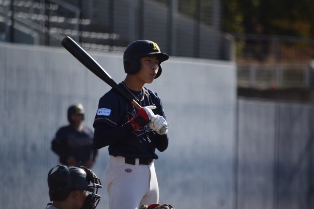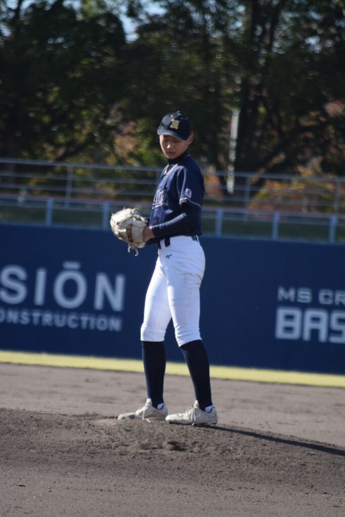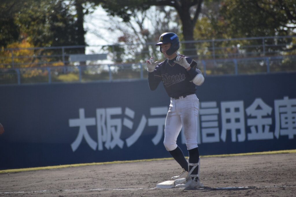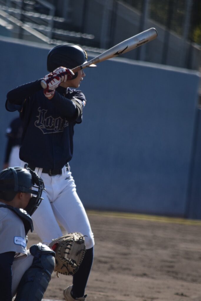 打線は3回まで沈黙していましたが、1-0で迎えた4回裏、先頭の山口賢輔くんがヒットで出塁すると中井くんが内野安打で続き3番岩永くん。初球をセンターオーバー3塁打で一気に逆転しました!続く小橋くんの打席でバッテリーエラーで1点を追加し3-1とリードを広げます。その小橋くんもレフト線2塁打でチャンスを作ると2死から奥葵生くんがセンター前に抜けるタイムリーヒットで4点目を追加します。